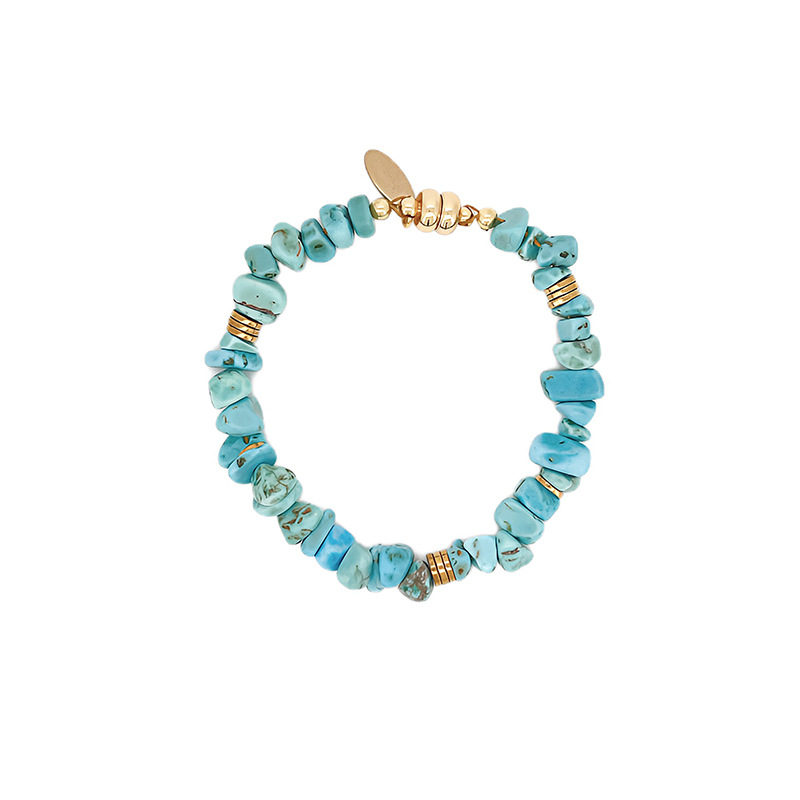 Composed of irregular turquoise chips showcasing natural textures and blue-green hues. Accented with gold spacer beads and a flat clasp, the minimalist metal details add refinement. This piece balances casual elegance, suitable for various everyday occasions.