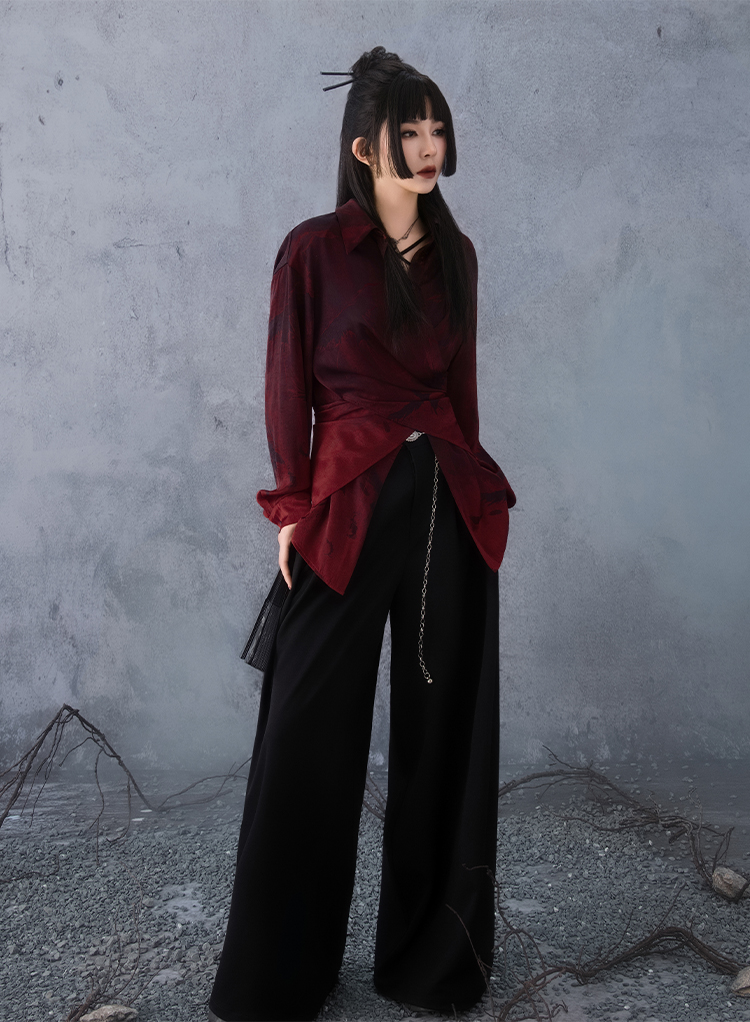 Combining raven motifs with black and red tones, this piece conveys mystery and artistry. The acetate-like satin fabric has a smooth luster and graceful drape, enhancing elegance. Its loose fit ensures comfort and versatility for different body types. Designed for two styling options, it can be worn as a relaxed shirt or wrapped into an X-shape, making it easy to pair with tailored trousers for daily wear.