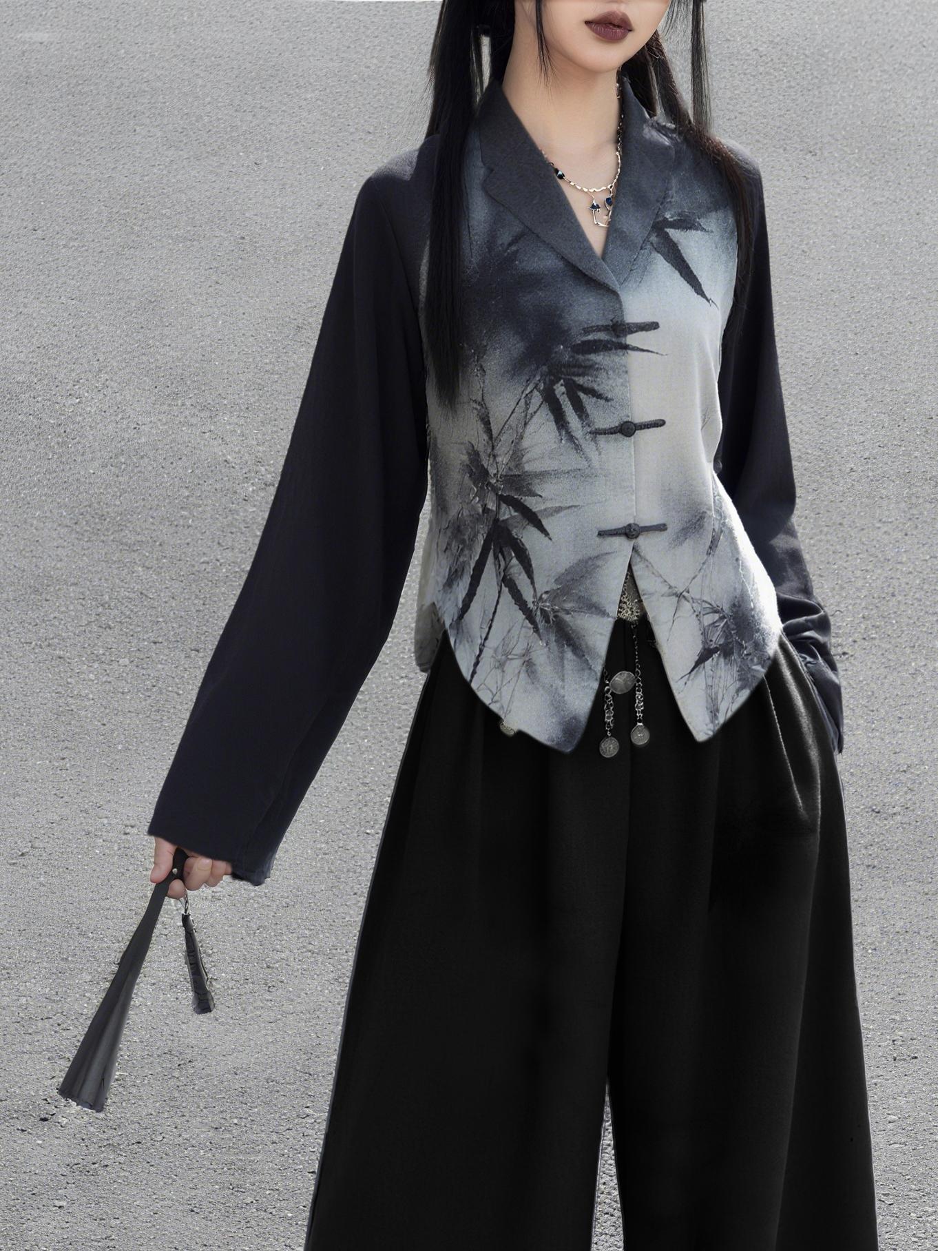 The garment features ink-wash bamboo shadows as the main pattern. The ink color fades from light to dark, natural and agile like a smudged ink painting, with bamboo leaves in vivid shapes. The neckline adopts a classic V-neck design to modify the neck line. The frog button element on the garment is a classic symbol of traditional Chinese clothing. It not only plays a practical role in securing the placket but also becomes a recognizable decorative highlight, demonstrating the profound heritage of traditional culture.