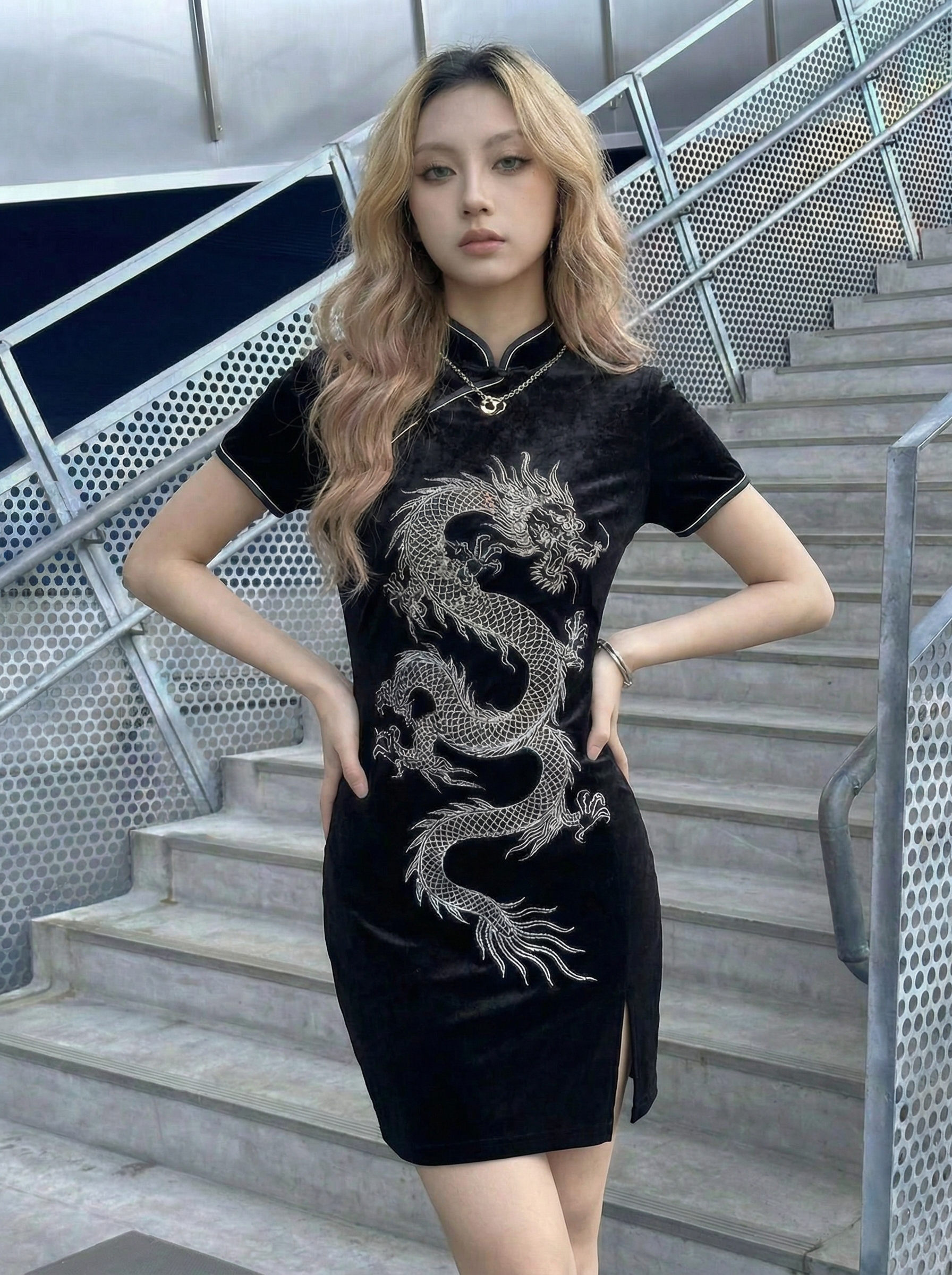 Turn heads in this modernized Cheongsam dress. Cut from stretchy, body-hugging velvet, it features a classic Mandarin collar, cap sleeves, and a seductive side slit. The large-scale dragon embroidery wraps dynamically across the front, creating a striking visual impact. Ideal for parties or evening wear.