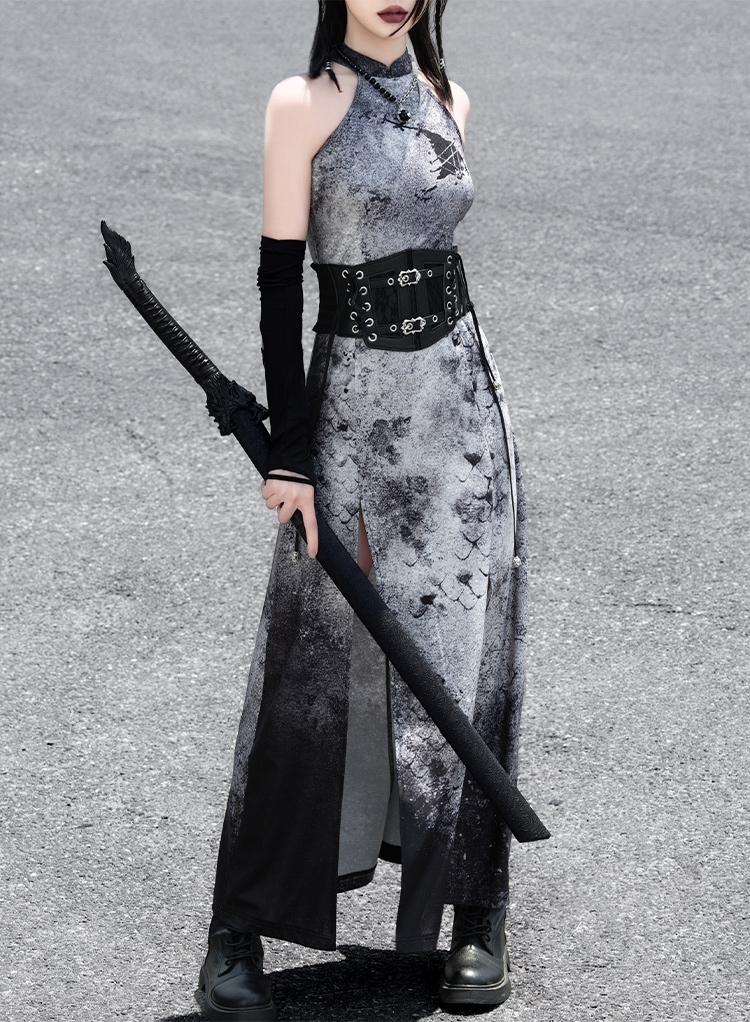 The halter neckline highlights sharp shoulder lines, while the asymmetric high slit adds a touch of mystery with every step. A blend of desert-toned gradients and snake-skin textures evokes a dystopian aesthetic. Paired with a structured leather waist belt and black arm covers, this look radiates futuristic cool—perfect for street style or editorial shoots, channeling bold attitude and striking presence.