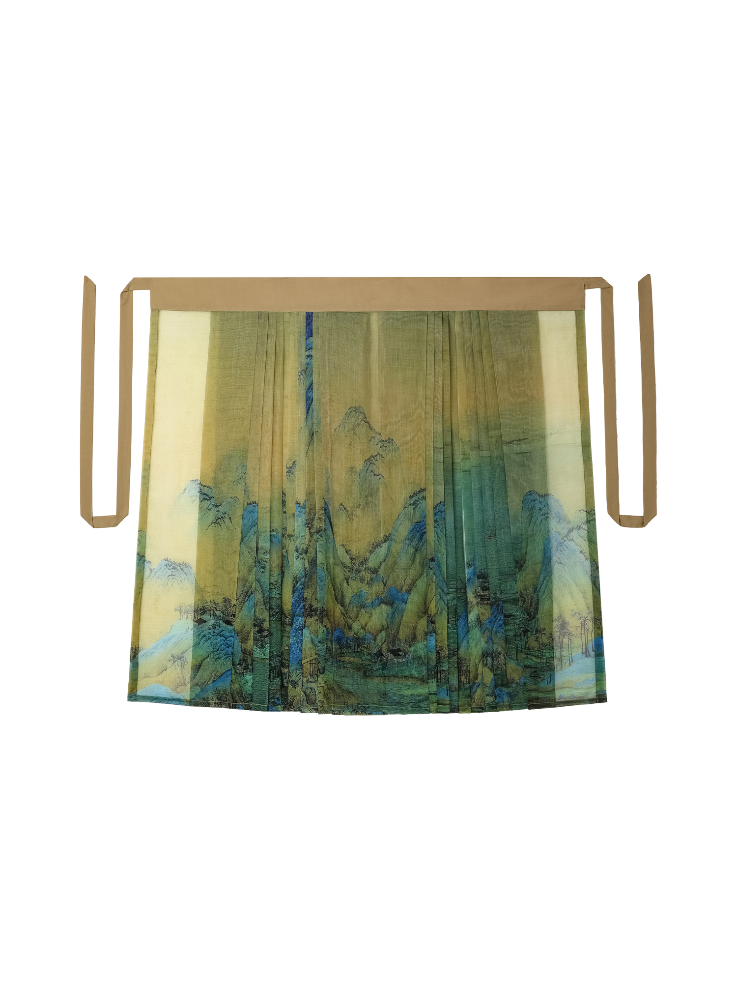 The design is inspired by the traditional masterpiece Thousand Miles of Rivers and Mountains, with a 6-meter wide skirt. This style comes with a cotton lining skirt.