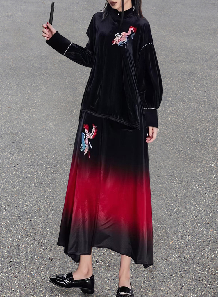 Rooted in a neo-Chinese aesthetic, the velvet fabric brings a strong retro touch, while the gradient red skirt flows like oriental poetry. The lively opera-inspired prints and loose sleeves outline a classical silhouette. Integrating opera culture into daily wear, the design revitalizes traditional aesthetics through modern skirt forms, infusing them with new fashion vitality.