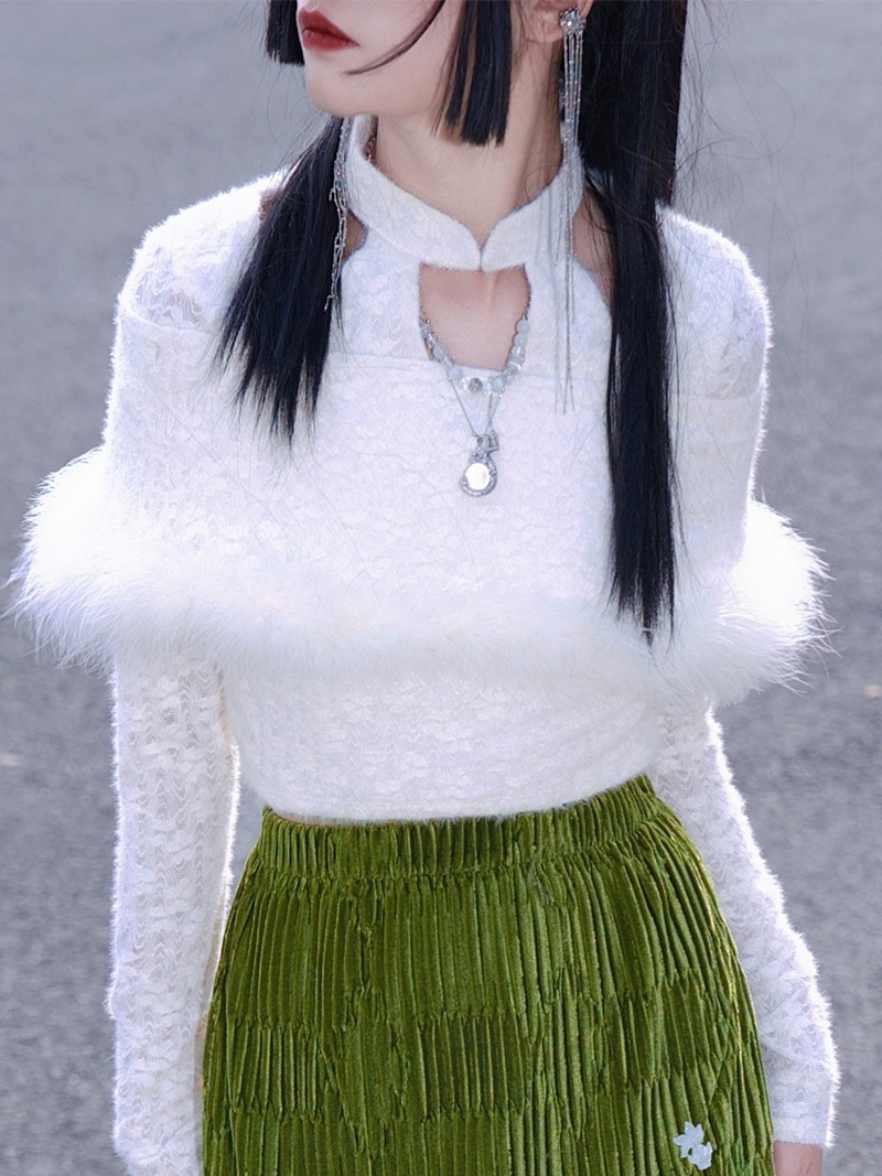 Designed for versatility with detachable features, perfect for layering. Delicate hollow designs at the neckline and shoulders, with fur trims enhancing body proportions and an elegant silhouette.