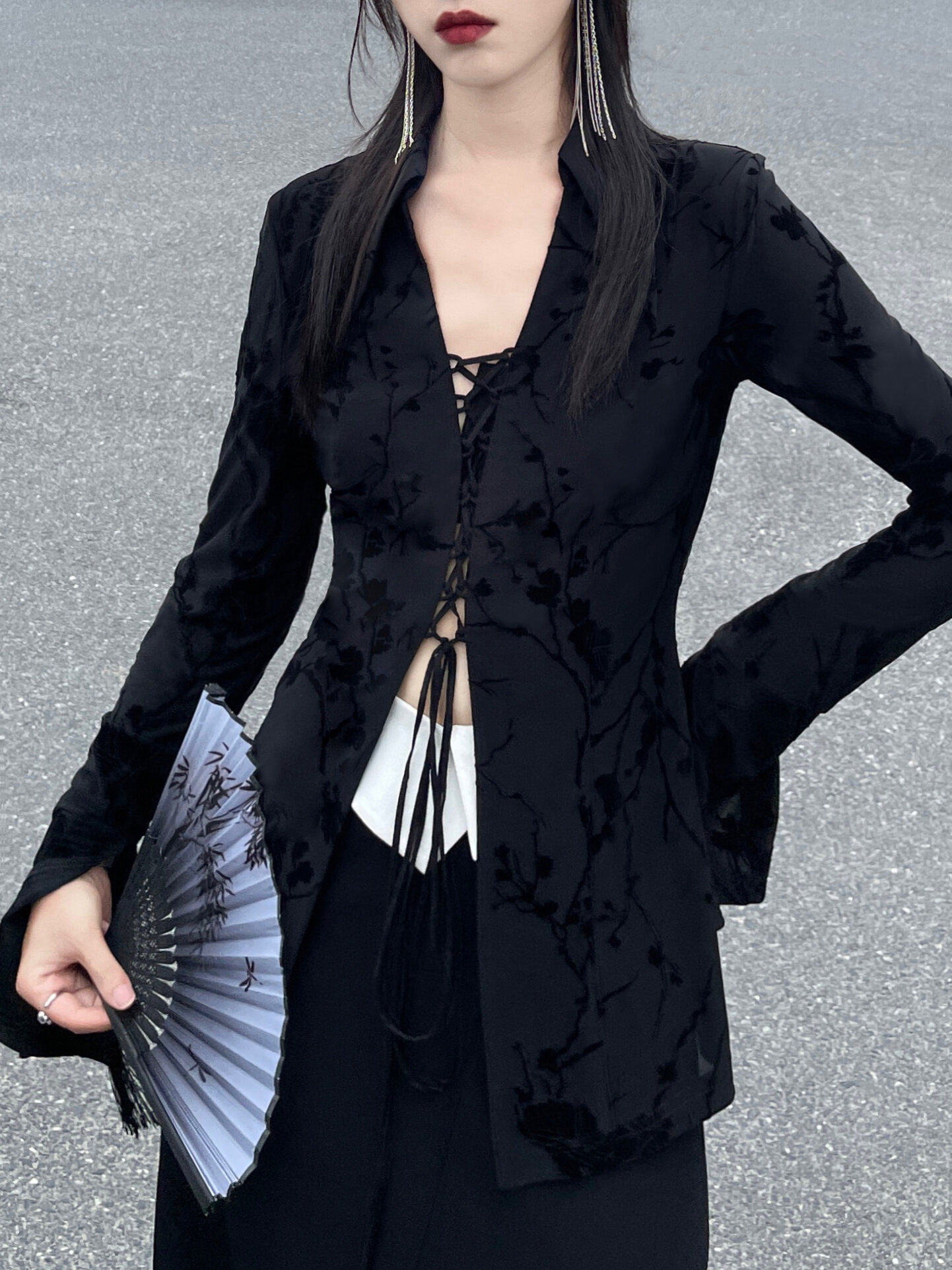 Featuring a new Chinese style with intricate plum blossom velveteen, this top is both comfortable and stylish, emphasizing your waist with a chic tie design.