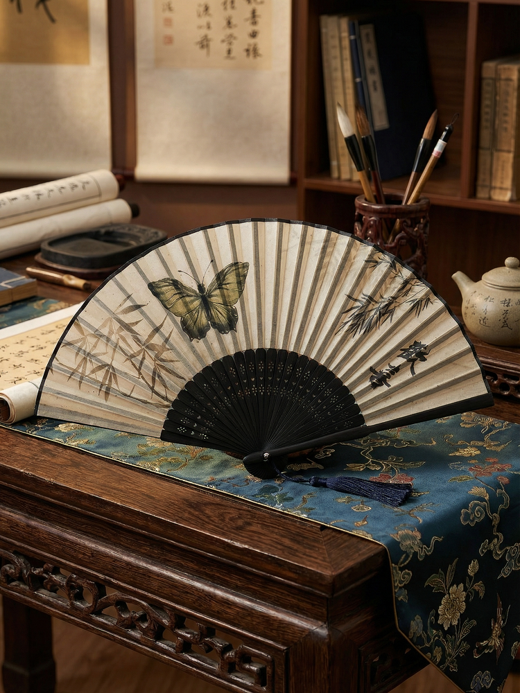 Designed with a vintage aesthetic, this folding fan features an antique beige face that mimics the look of aged paper. The artwork centers on a large, detailed butterfly, flanked by ink-wash style bamboo leaves and bold black Chinese calligraphy characters on the right. The frame is constructed from matte black bamboo ribs, which are embellished with small, delicate cutout patterns along the wider lower section. A simple black tassel completes the traditional look.