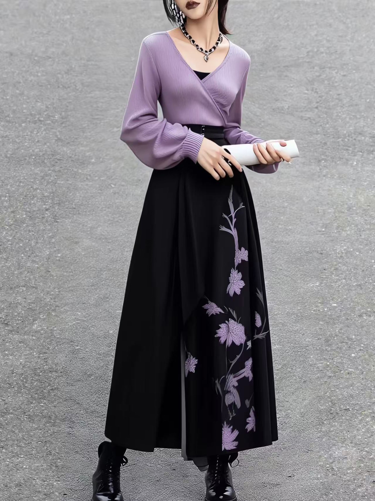 The soft viola knit top features a V-neck and relaxed silhouette, offering a sense of ease. The black embroidered skirt incorporates traditional floral motifs with an asymmetric cut that enhances the design. Suitable for oriental-inspired or literary occasions, this look merges vibrant contrasts and embroidery details to interpret a romantic New Chinese style, balancing tradition with trend.
