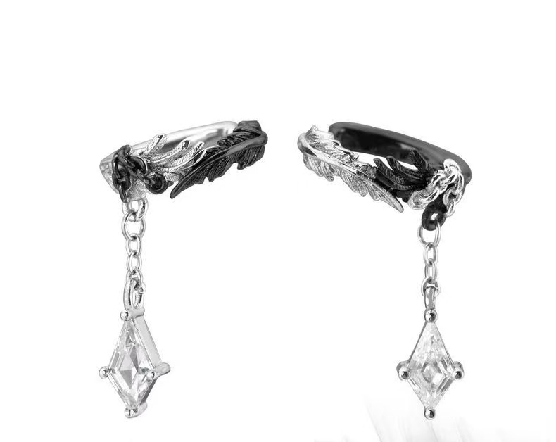 These earrings feature a refined design that blends style with individuality. Inspired by feather motifs, the lightweight metal construction mimics delicate plumage, with blackened accents adding contrast and depth for a mysterious flair. A faceted rhombus-shaped crystal dangles beneath, capturing and reflecting light with every movement. This harmonious fusion of natural elements and contemporary design lends both elegance and distinct personality—perfect for elevating everyday looks or special occasion outfits.