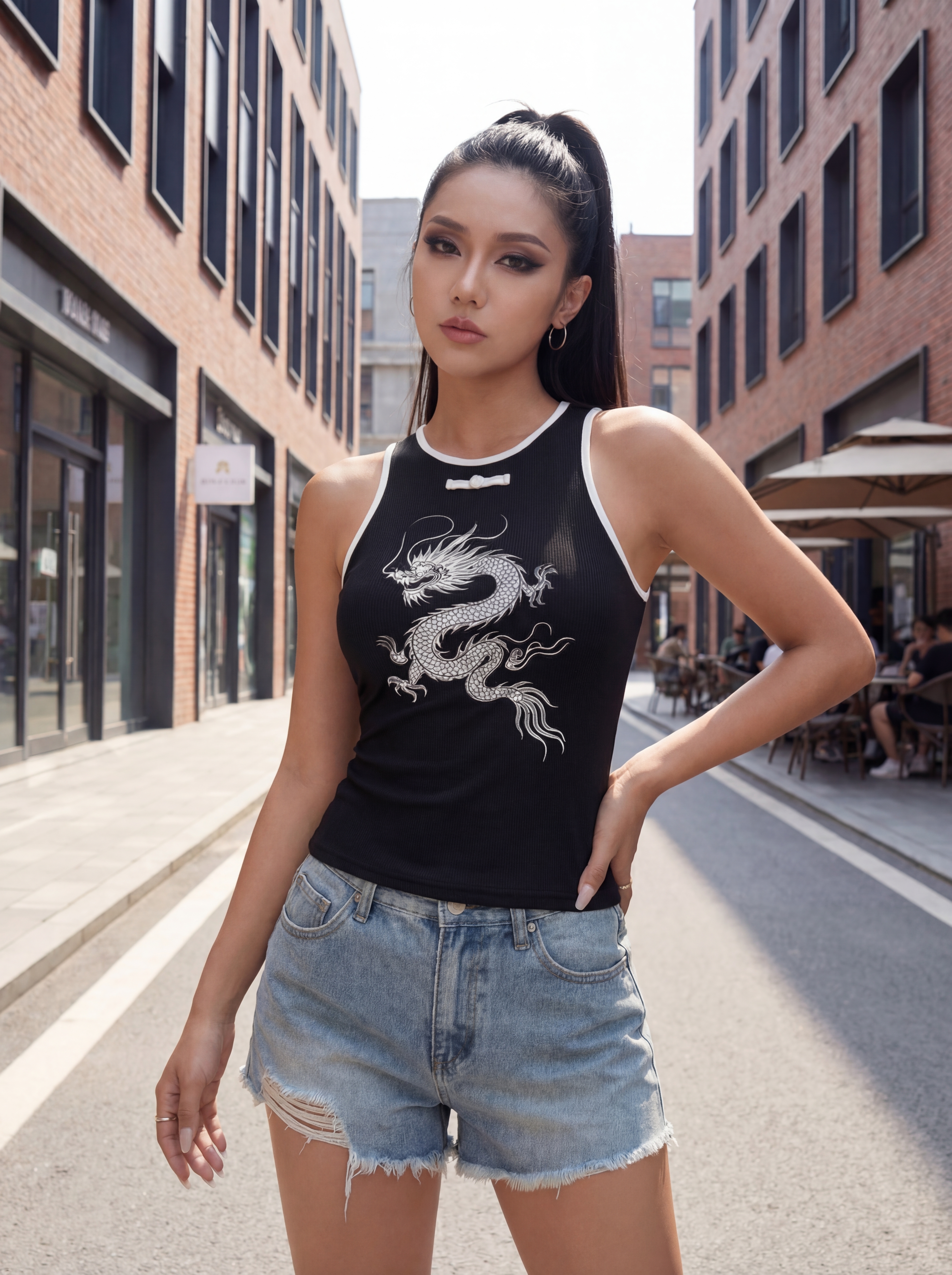 An edgy and flattering silhouette for the modern street muse. This black dragon print tank top is designed to stand out with its bold front dragon graphic and sleek body-hugging fit. Featuring a round neckline, sleeveless cut and contrast trim detailing, this top creates a cool and confident streetwear look.