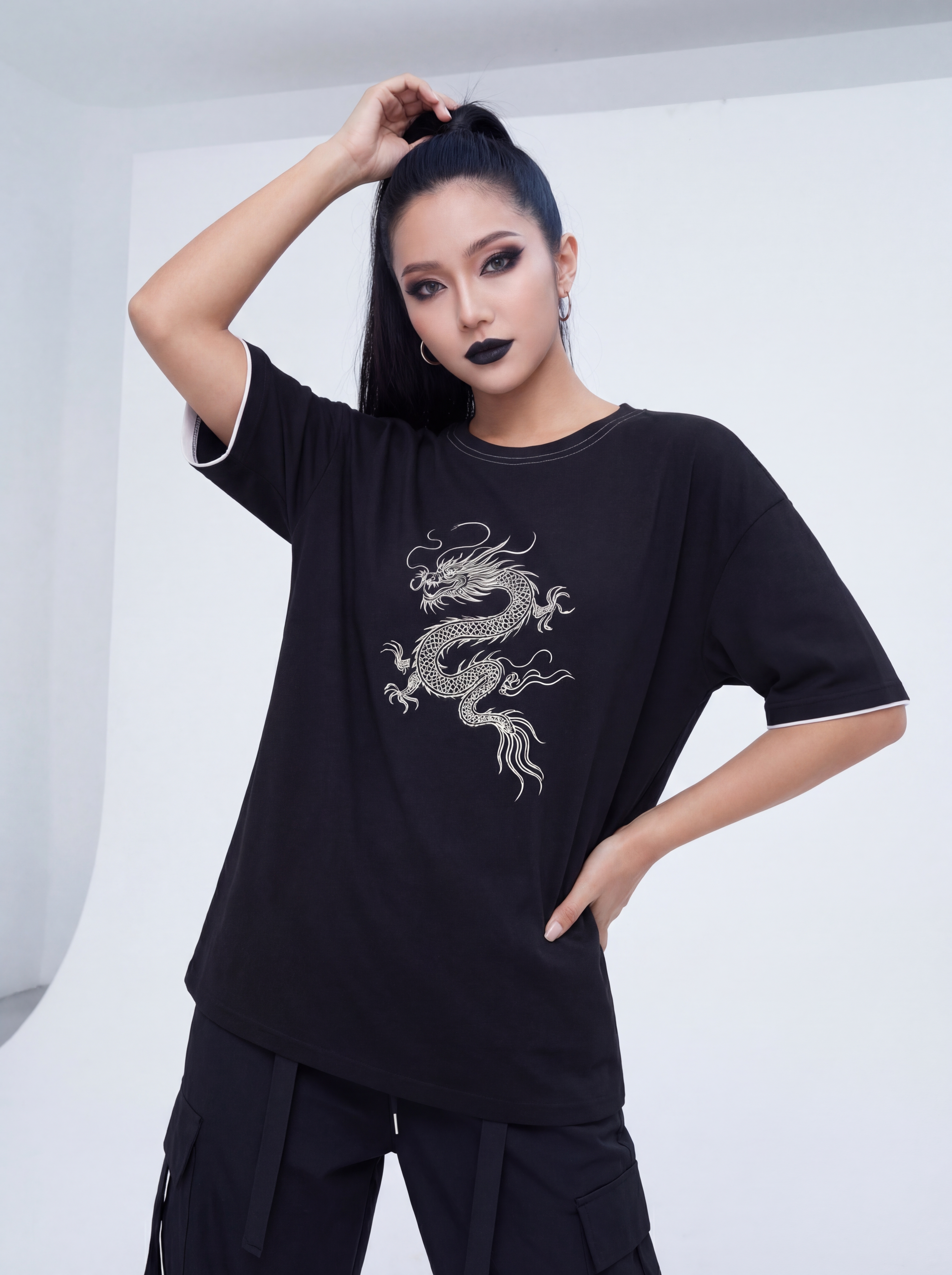 A modern oversized essential with a bold graphic edge. This black dragon graphic T-shirt is designed for effortless everyday styling, combining a relaxed silhouette with a striking front print. The classic crew neckline and dropped shoulder shape create an easy streetwear look, while the monochrome dragon artwork adds a distinctive statement without being overpowering. Pair it with cargo pants, denim, shorts, or joggers for an elevated casual outfit.