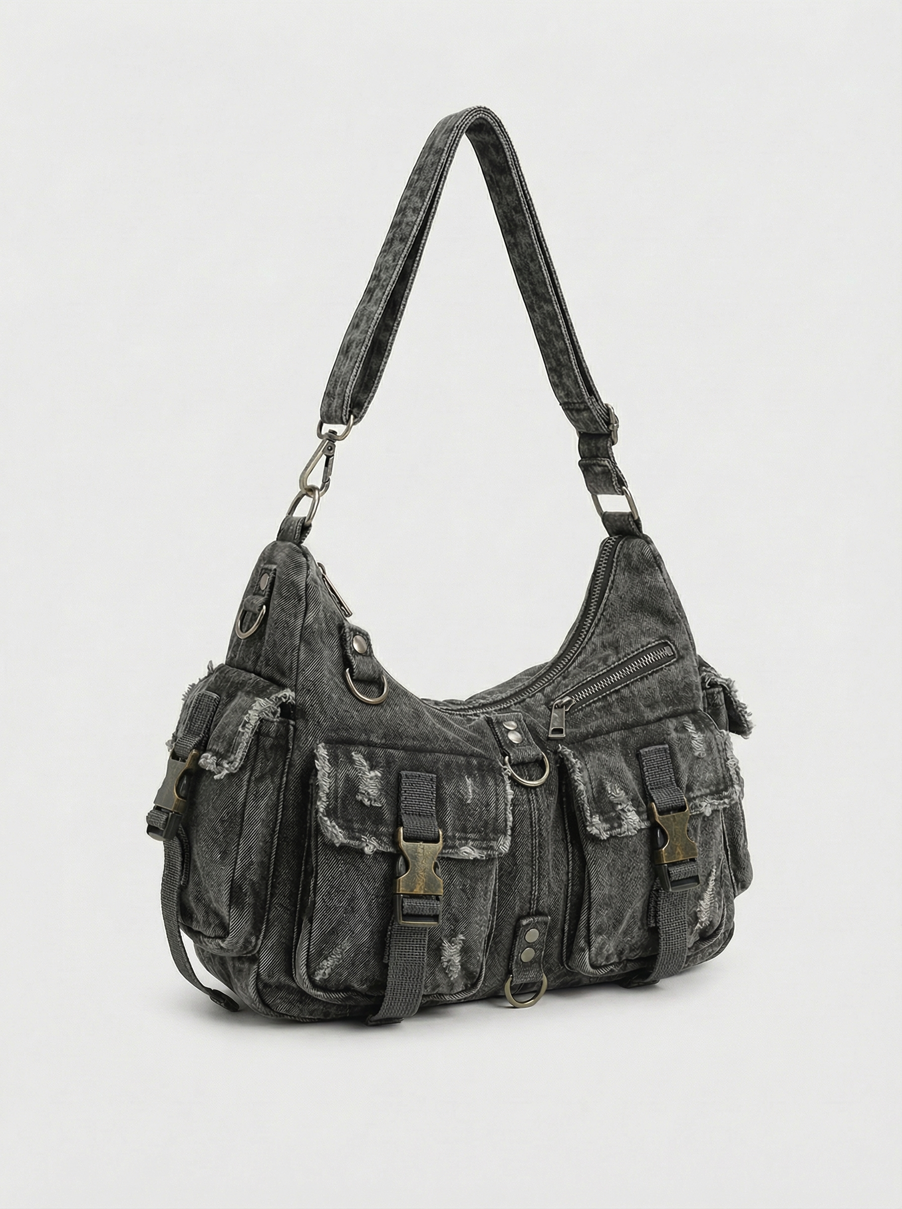 - Decorative Details: Frayed raw edges, canvas webbing straps, multiple cargo pockets