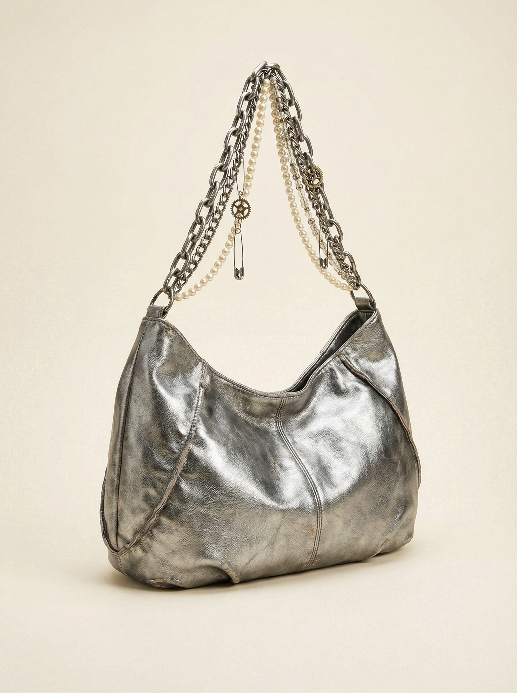 - Multi-Layered Eclectic Strap: A masterful collision of styles. The handle combines heavy-duty industrial chains with an elegant string of pearls, creating a captivating contrast.