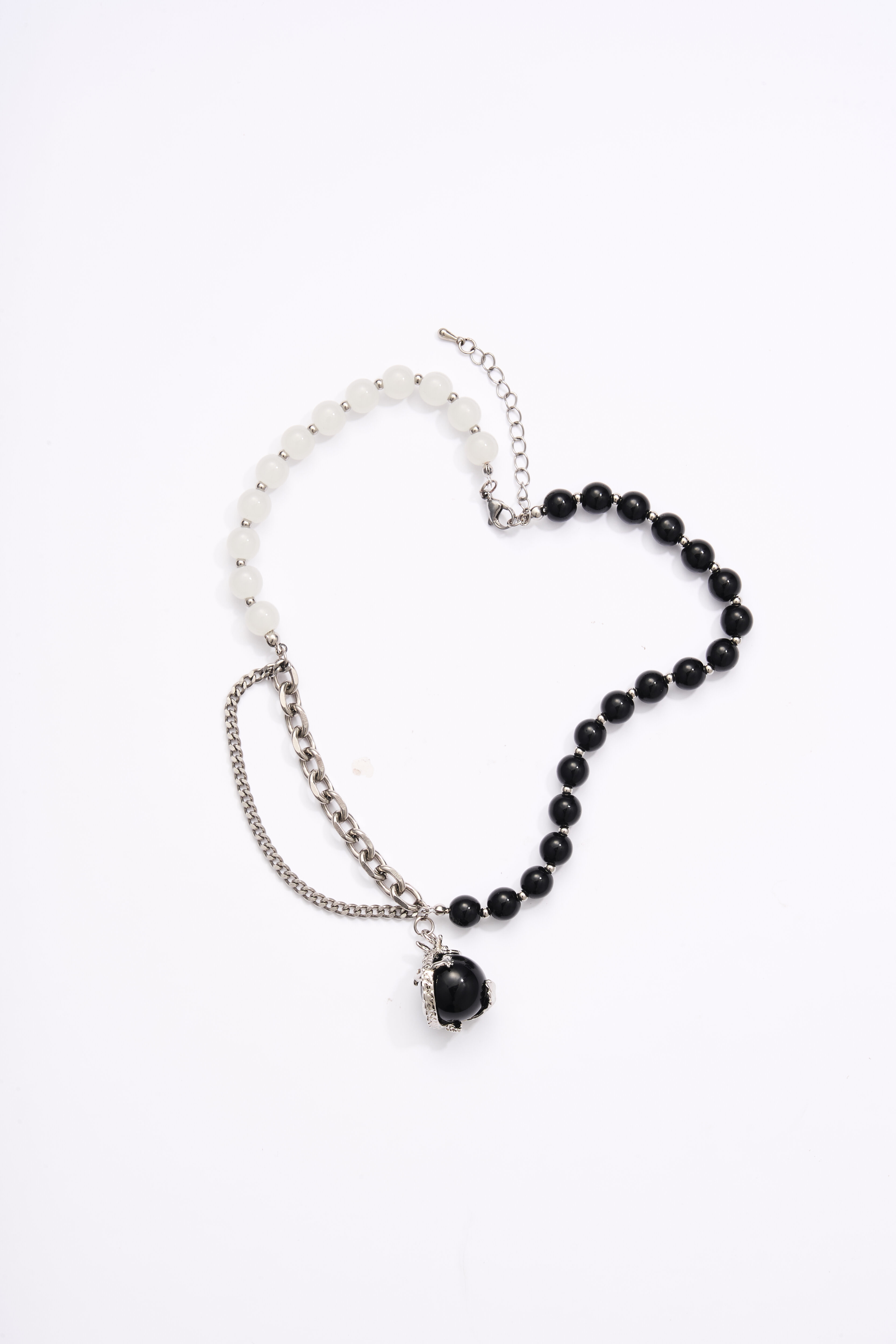Crafted with alternating black and white beads, symbolizing the balance of Yin and Yang. Interwoven silver chains add dimension and a modern touch. The central black bead pendant is framed with fine metalwork and delicately carved with a coiled dragon motif, featuring distinct scales and claws. The overall design merges traditional Chinese dragon elements with contemporary style—minimalist yet bold, mysterious yet elegant.
