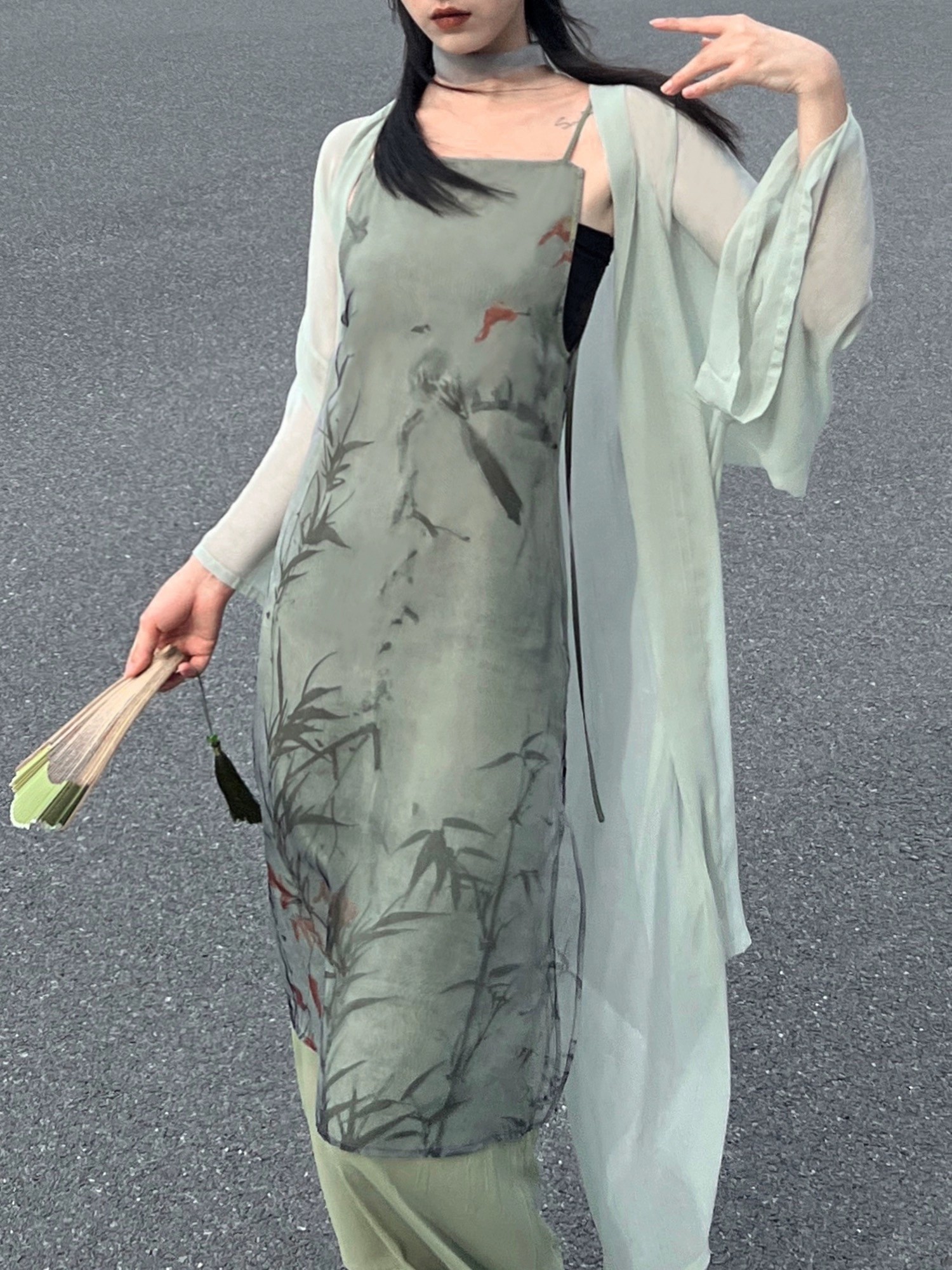 Crafted from sheer chiffon with crinkled irregular stripes, this piece evokes a refined, zen aesthetic. The Song-style collar elongates the neck, while wide sleeves make it versatile for pairing with all types of clothing.